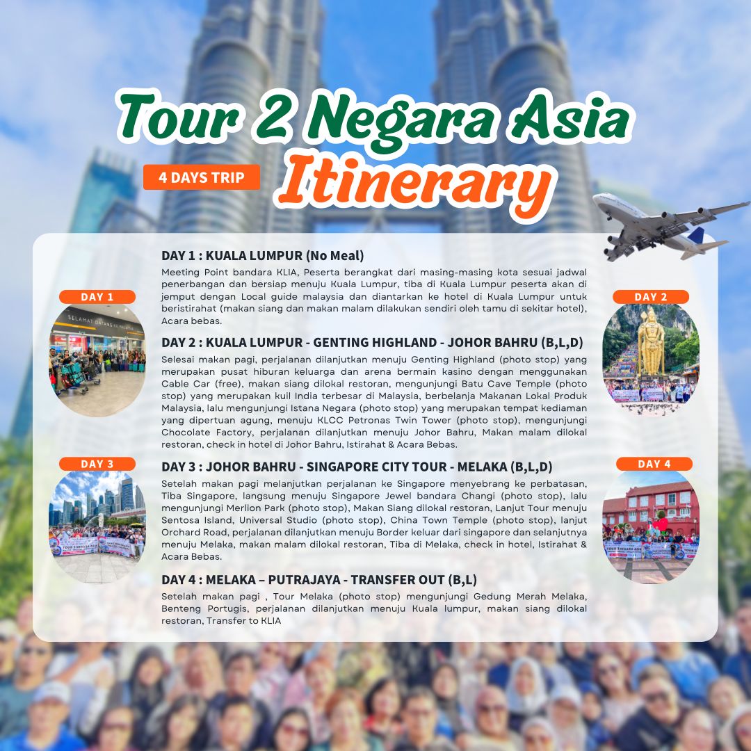 DAY 2 : KUALA LUMPUR – GENTING HIGHLAND – PUTRAJAYA – JOHOR BAHRU (B,L,D)Selesai makan pagi, perjalanan dilanjutkan menuju Genting Highland (photo stop) yang merupakan pusat hiburan keluarga dan arena bermain kasino dengan menggunakan Cable Car (free), makan siang dilokal restoran, mengunjungi Batu Cave Temple (photo stop) yang merupakan kuil India terbesar di Malaysia, berbelanja Makanan Lokal Produk Malaysia, lalu mengunjungi Istana Negara (photo stop) yang merupakan tempat kediaman yang dipertuan agung, menuju KLCC Petronas Twin Tower (photo Stop), mengunjungi Chocolate Factory, perjalanan dilanjutkan menuju Putrajaya (photo stop), Putrajaya adalah merupakan pusat pemerintahan Malaysia, lanjut Makan malam di lokal restoran,lanjut menuju Johor Bahru, check in hotel di Johor Bahru, Istirahat & Acara Bebas.