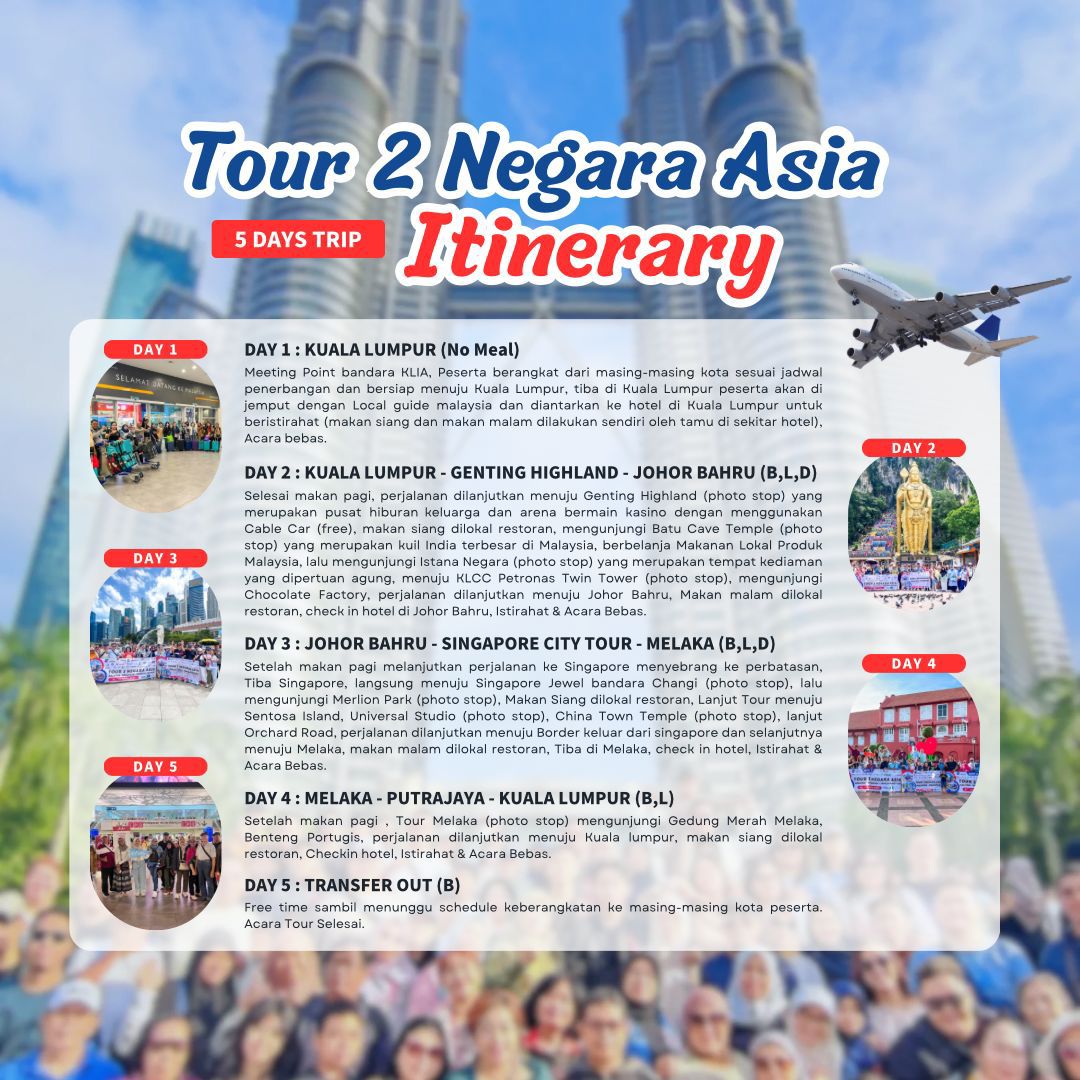 DAY 1 : KUALA LUMPUR (No Meal) Meeting Point bandara KLIA, Peserta berangkat dari masing-masing kota sesuai jadwal penerbangan dan bersiap menuju Kuala Lumpur, tiba di Kuala Lumpur peserta akan di jemput dengan Local guide malaysia dan diantarkan ke hotel di Kuala Lumpur untuk beristirahat (makan siang dan makan malam dilakukan sendiri oleh tamu di sekitar hotel), Acara bebas.Hotel : Avenue J Hotel / setaraf *3 Kuala LumpurDAY 2 : KUALA LUMPUR – GENTING HIGHLAND – PUTRAJAYA – JOHOR BAHRU (B,L,D) Selesai makan pagi, perjalanan dilanjutkan menuju Genting Highland (photo stop) yang merupakan pusat hiburan keluarga dan arena bermain kasino dengan menggunakan Cable Car (free), makan siang dilokal restoran, mengunjungi Batu Cave Temple (photo stop) yang merupakan kuil India terbesar di Malaysia, berbelanja Makanan Lokal Produk Malaysia, lalu mengunjungi Istana Negara (photo stop) yang merupakan tempat kediaman yang dipertuan agung, menuju KLCC Petronas Twin Tower (photo Stop), mengunjungi Chocolate Factory, perjalanan dilanjutkan menuju Putrajaya (photo stop), Putrajaya adalah merupakan pusat pemerintahan Malaysia, lanjut Makan malam di lokal restoran, lanjut menuju Johor Bahru, check in hotel di Johor Bahru, Istirahat & Acara Bebas.Hotel : Millesime Hotel / setaraf *3 Johor BahruDAY 3 : JOHOR BAHRU – SINGAPORE CITY TOUR – MELAKA (B,L,D) Setelah makan pagi melanjutkan perjalanan ke Singapore menyebrang ke perbatasan, Tiba Singapore, langsung menuju Singapore Jewel Changi Airport (photo stop), lalu mengunjungi Merlion Park (photo stop), Makan Siang dilokal restoran, Lanjut Tour menuju Sentosa Island, Universal Studio (photo Stop), Photo Stop China Town Temple, lanjut Orchard Road, perjalanan dilanjutkan menuju Border keluar dari singapore dan selanjutnya menuju Melaka, makan malam dilokal restoran, Tiba di Melaka, check in hotel, Istirahat & Acara Bebas.Hotel : Balik Pulau Hotel / setaraf *3 MelakaDAY 4 : MELAKA – KUALA LUMPUR (B,L) Setelah makan pagi , Tour Melaka (photo stop) mengunjungi Gedung Merah Melaka, Benteng Portugis, Jonker Street, dll. Lanjut perjalanan ke Kuala Lumpur, makan siang dilokal restoran, check in hotel, Istirahat & Acara Bebas.