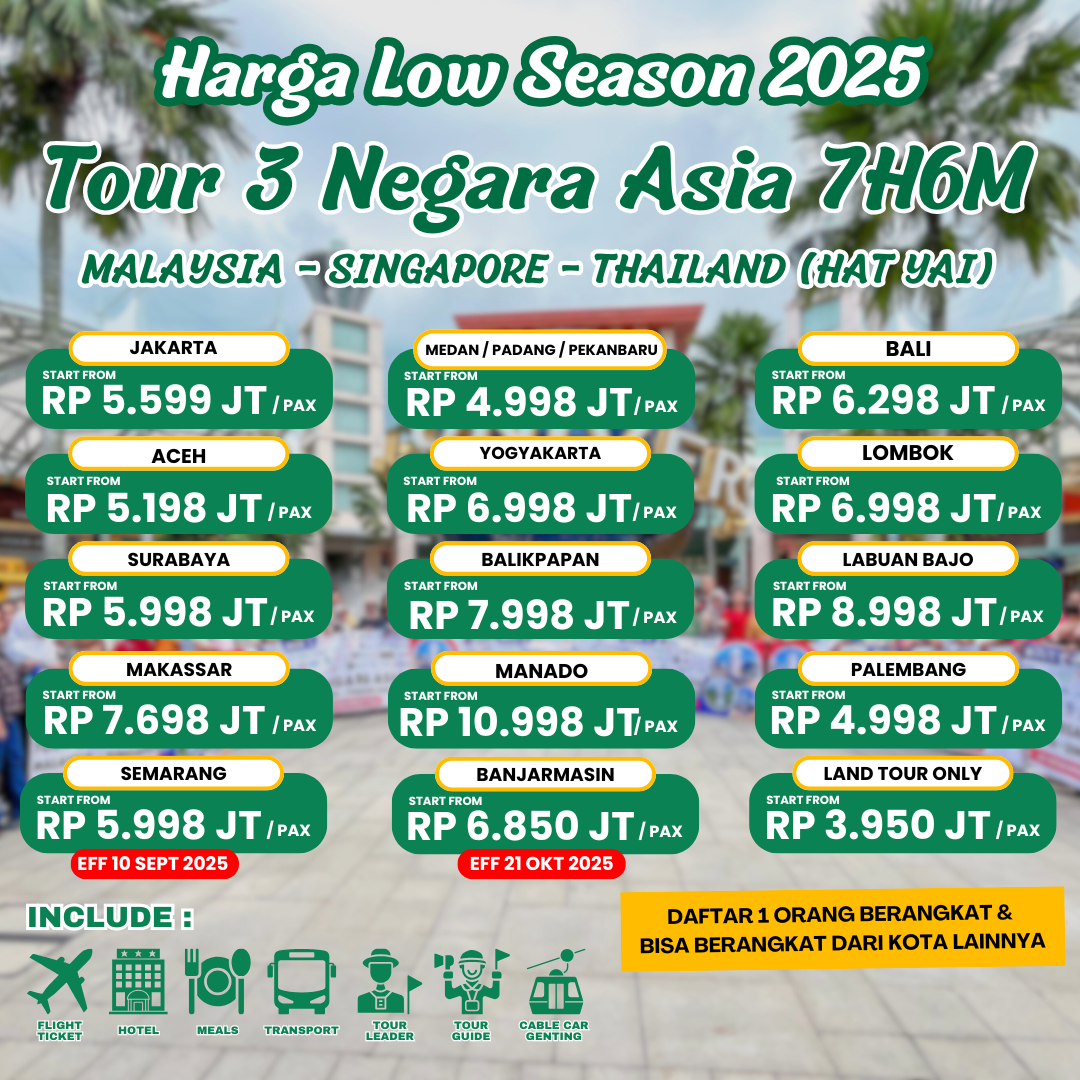 • Paket tour perjalanan kami dapat dibeli di travel agent kesayangan kalian yang terafiliasi dengan Konsorsium Nasional.